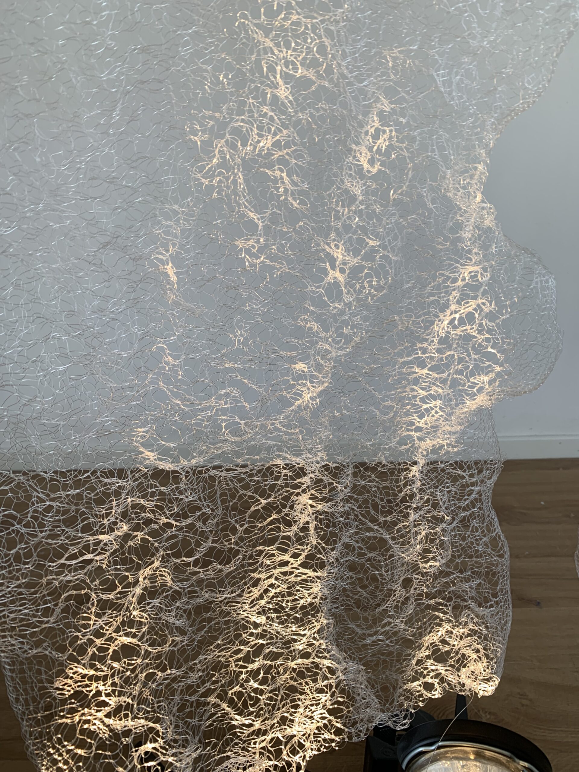 “Some reptiles shed their skin to grow and renew themselves, some insects create cocoons when they undergo a change or transformation. In my exhibition “Shedding Skin” I have knitted fishing line into long strips that hang from the ceiling. Like snake skins left over after molting, the strips mark the remains of a process of change. The strips form transparent grids and fishing line is a grateful light material, which is here installed with a special lighting setup. In my works, there is often a wordless communication where the beautiful and slow emerge, similar to light phenomena in nature that constantly change and at the same time return in seasonal and daily rhythms. “Shedding Skin” is about the membranes between the inner and the outer, and about the desire to, like a reptile, create a new boundary between the self and the outside world.”