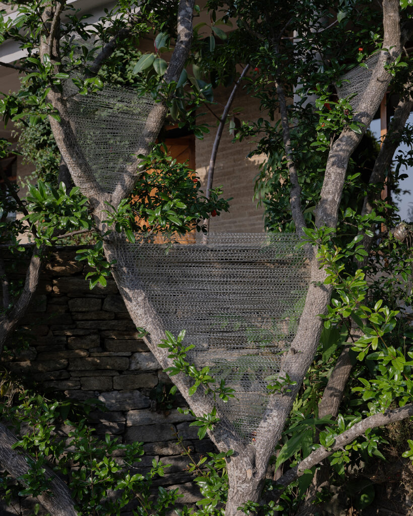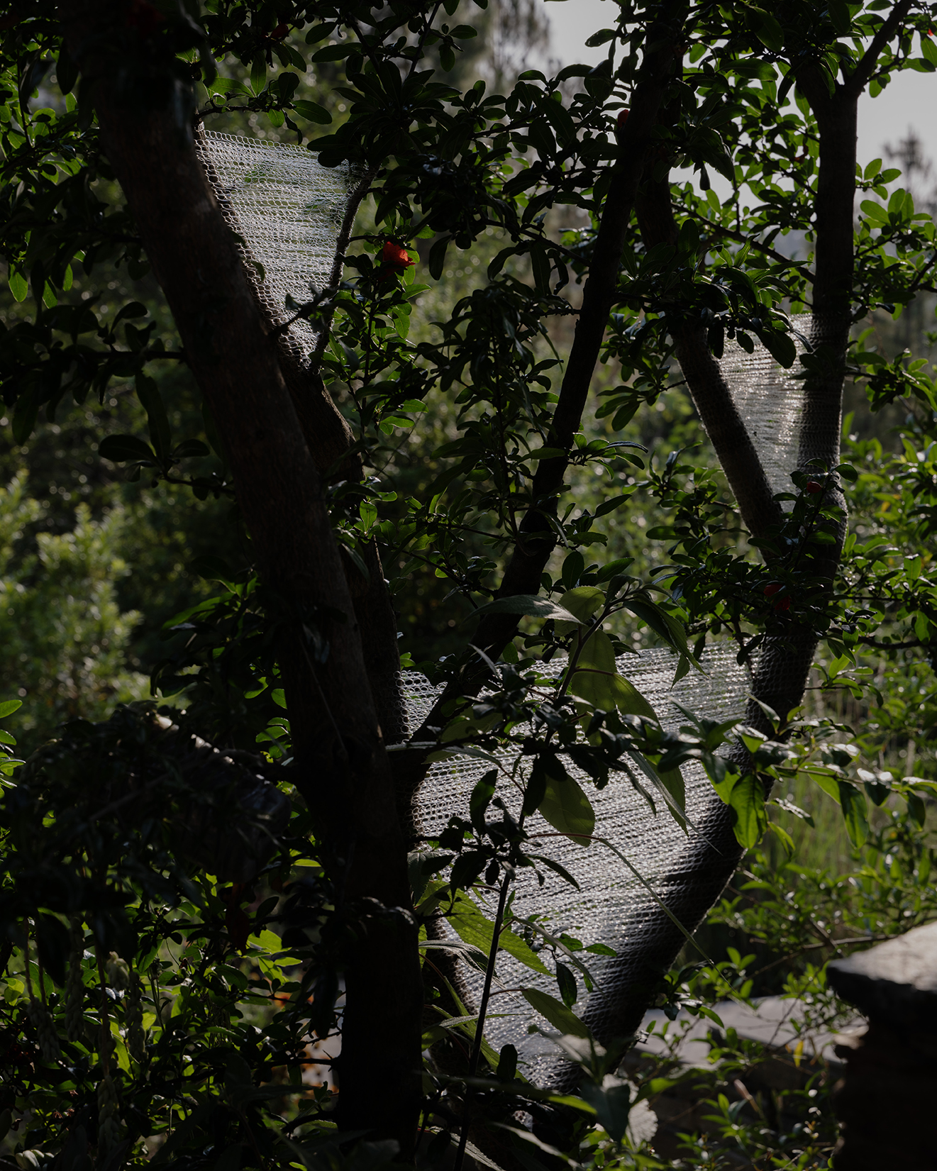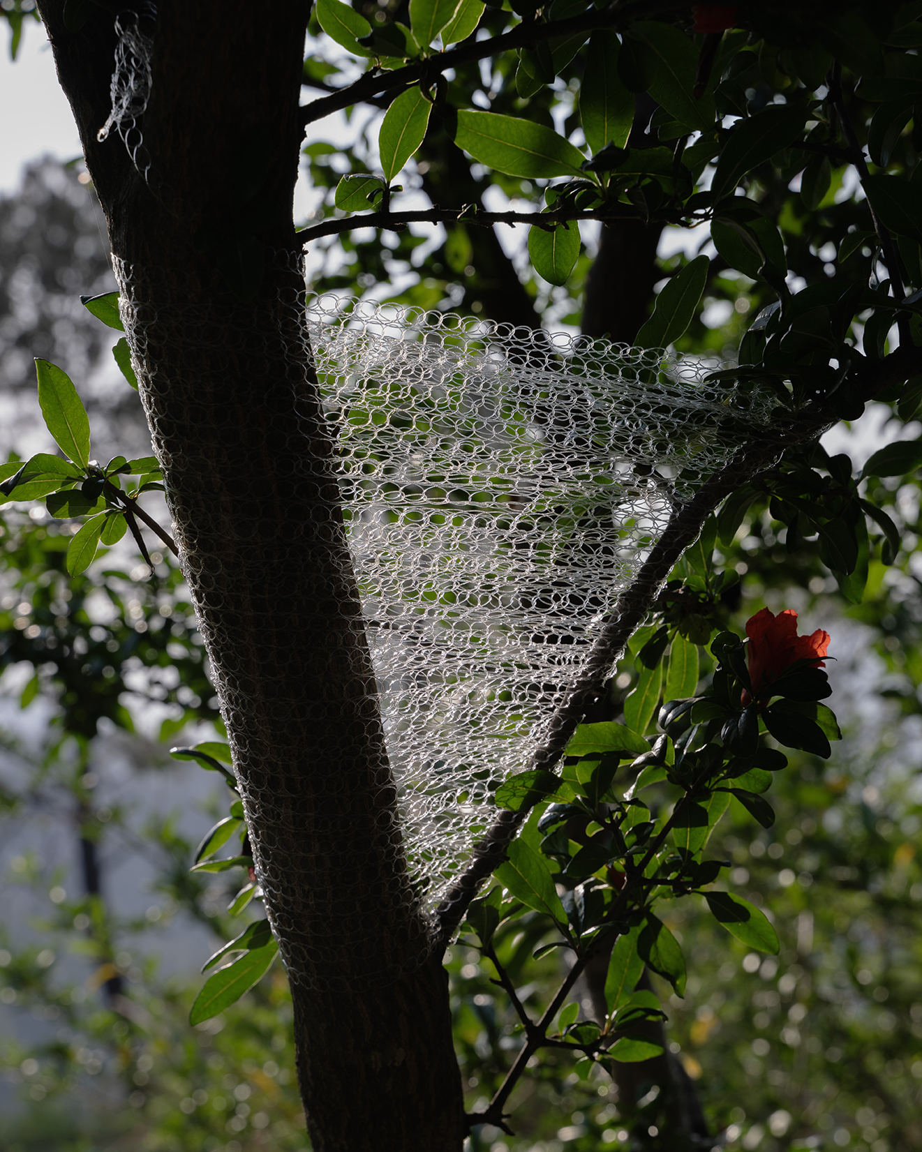 About the work: “Netting/nesting” is an installation with crocheted fishing line in the diameter of .45 mm in five parts installed in the pommegranate tree by the entrance of Spacehouse Himalayas. It was produced during the artist residency of 3 weeks in the same place. It had the working title “Triangular Thoughts for a Tree” and the 5 different parts interact and reflect natural light at day and artificial light at night, somewhat ressembling spiders’ nets or nests.More information about the residency can be found at Spacehousehimalayas.com/artists