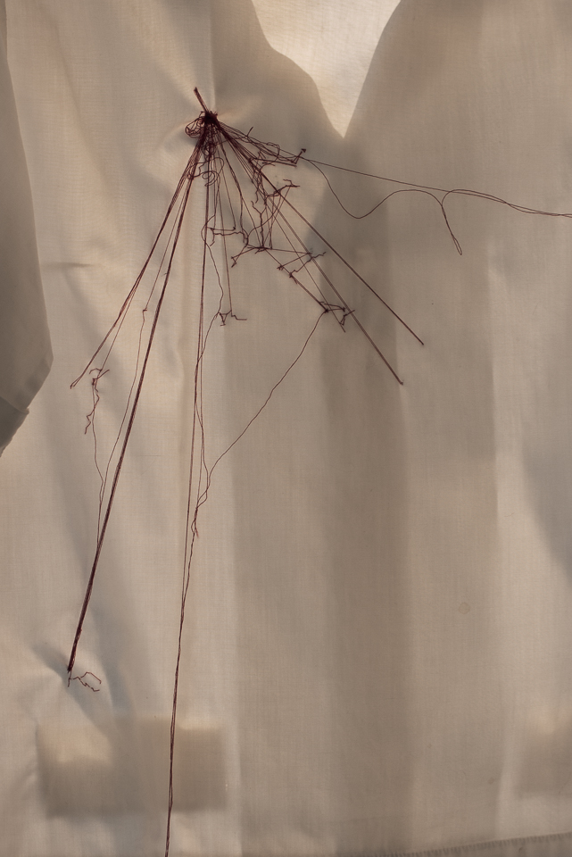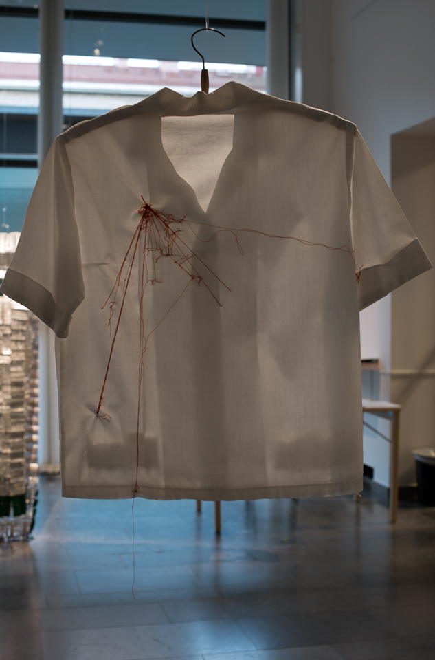 The Way Home is an installation of my maternal grandmother’s blouse, red thread and a re-used coat hanger. The blouse is sewn together through the back and front pieces. The Way Home shows a map of all the journeys I made while growing up. Until the age of 13, the journeys were fun and everyone in the family was healthy. After that, others in the family and myself became ill during longer periods, yet the journeys continued. As I sew the map, it became physically harder and harder for every journey to push the needle back through the hometown that was placed in the heart area of the blouse. The process of sewing became an unwanted reliving of the pain of living with, and even more trying to travel with, severe illnesses in the family.